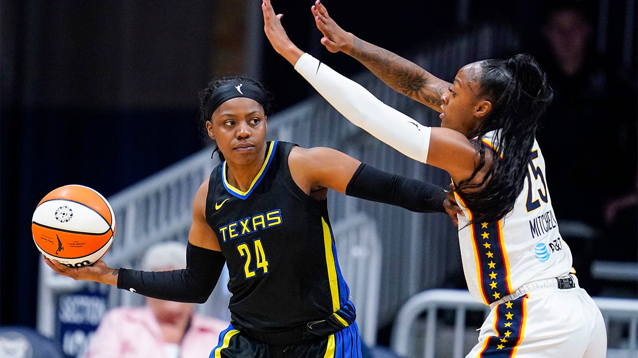 Dallas Wings guard Arike Ogunbowale (24) holds off Indiana Fever guard Tiffany Mitchell (25) in the first half of a WNBA basketball game in Indianapolis, Sunday, July 24, 2022. (AP Photo/Michael Conroy)