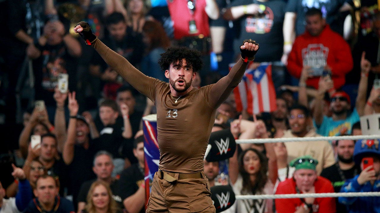 Bad Bunny celebrates his victory on the ring during the WWE Backlash at Coliseo de Puerto Rico José Miguel Agrelot on May 6, 2023 in San Juan, Puerto Rico. (Gladys Vega/ Getty Images)