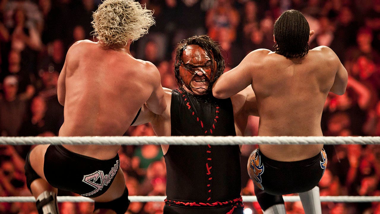 Kane taking two top stars down during the WWE "Raw" event at Rose Garden arena in Portland, Ore., Feb. 27, 2012. (Ryan/Corbis via Getty Images)