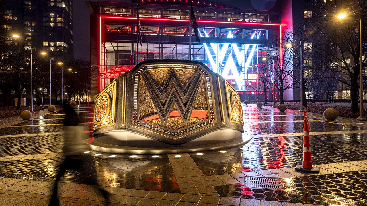 A WWE logo shines from the WWE wrestling world headquarters Jan. 28, 2024, in Stamford, Conn. (John Moore/Getty Images)