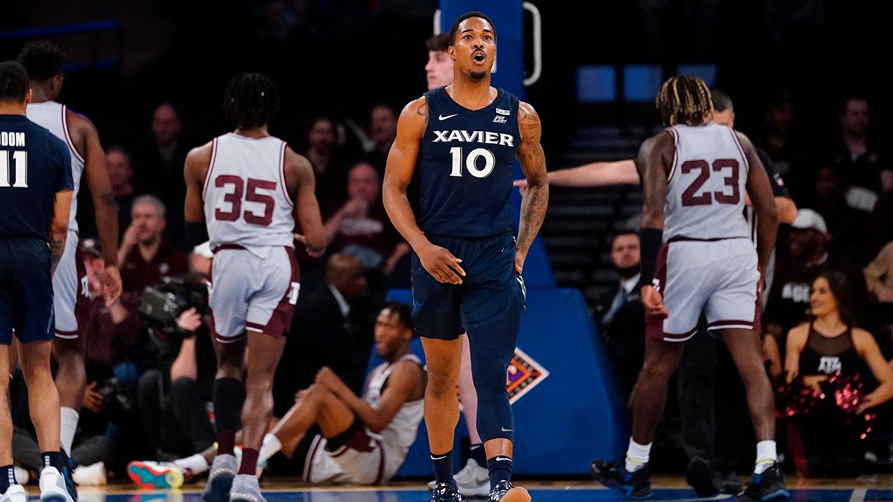 Texas A&M blocked a shot out of bounds on the other end, and Xavier inbounded from the baseline. Jones found Nunge inside and he wheeled into the lane and banked in a one-handed turnaround shot that put Xavier ahead 73-72.