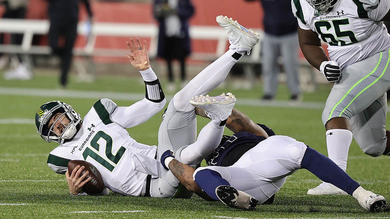 Quinten Dormady (12) of the Orlando Guardians is sacked by Charles Wiley (57) of the Houston Roughnecks at TDECU Stadium Feb. 18, 2023, in Houston. (Bob Levey/Getty Images)
