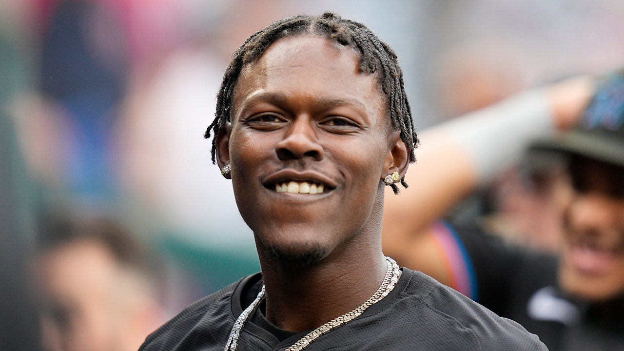 Jazz Chisholm Jr. of the Miami Marlins reacts during the seventh inning against the Philadelphia Phillies in Game 2 of a wild-card series at Citizens Bank Park Oct. 4, 2023, in Philadelphia. (Tim Nwachukwu/Getty Images)
