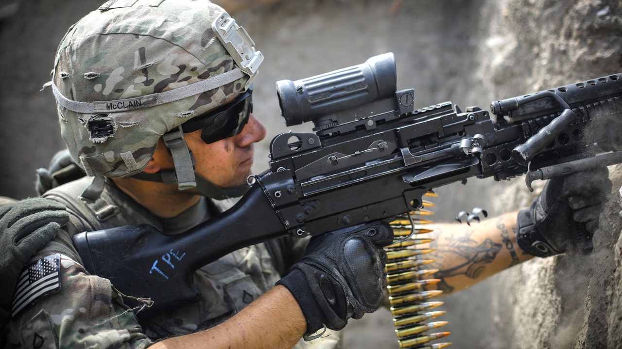 A US soldier from 2-12 Infantry Regiment out of Colorado Springs fires a machine gun at insurgent positions during a firefight on June 22, 2012 in the Pech Valley, Afghanistan - file photo. (Photo by John Cantlie/Getty Images)
