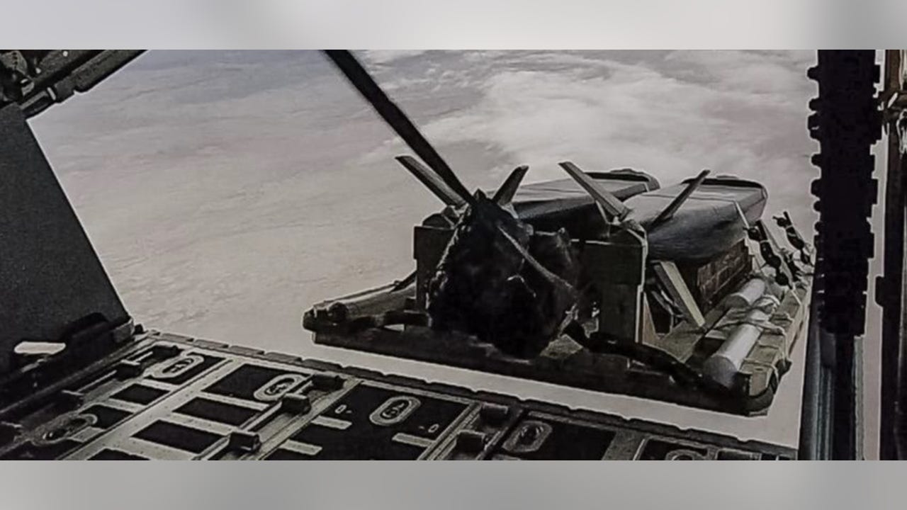The Special Operations plane released three Combat Expendable Platforms carrying munitions stacked up on wooden pallets. The CEPs, according to an Air Force report, were configured with six simulated munitions, the same mass as the actual weapons across a “spectrum of high and low altitude airdrops.”