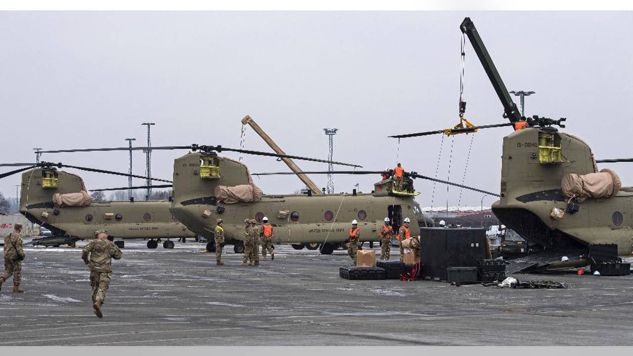 U.S. Technicians prepare helicopters for the transport in Bremerhaven, northern Germany, Sunday Feb. 12, 2017. (Ingo Wagner/dpa via AP) (The Associated Press)