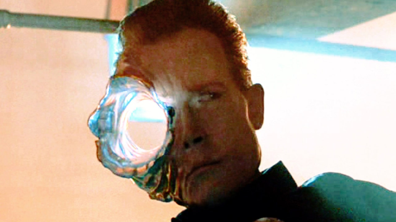 The movie "Terminator 2: Judgment Day", directed by James Cameron. Seen here, the T-1000 Terminator, in partial liquid metal form, suffers from a gunshot blast to the head. (Photo by CBS via Getty Images)