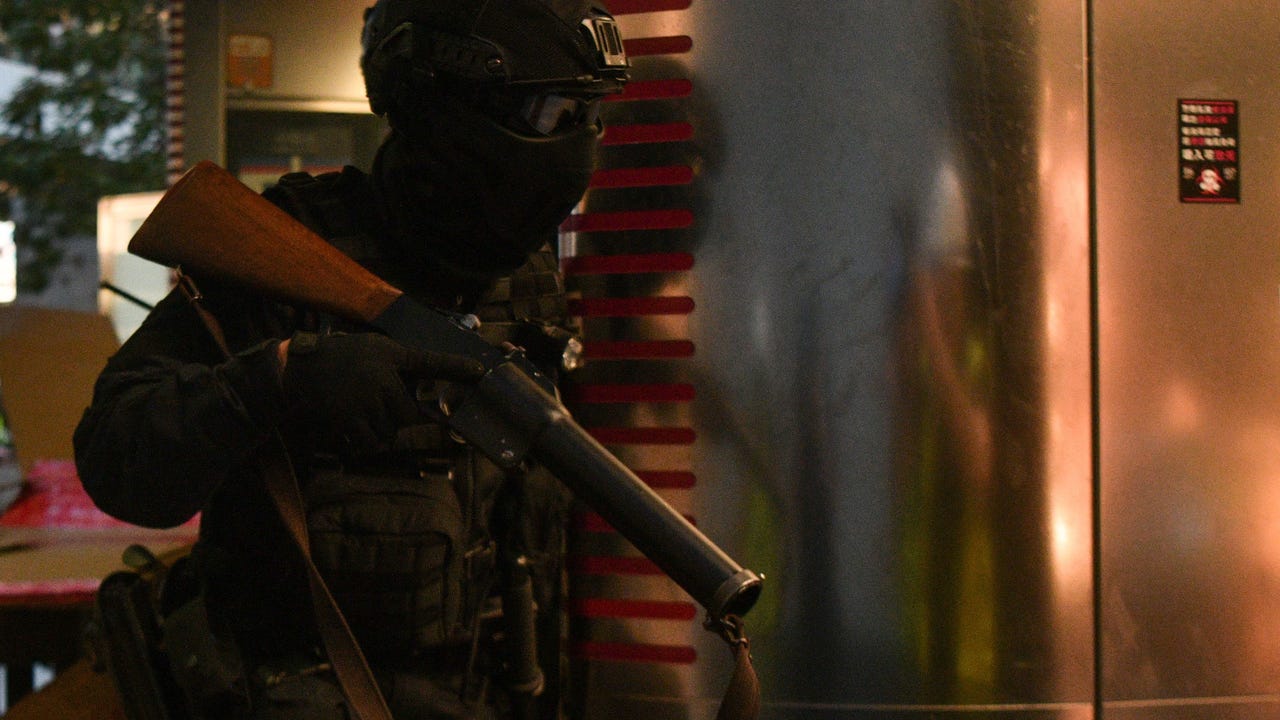 A riot police officer brandishing a teargas launcher emerges out of the Central MTR subway station after breaking barricades to exit, in Hong Kong on Sept. 8. ((ANTHONY WALLACE/AFP/Getty Images))