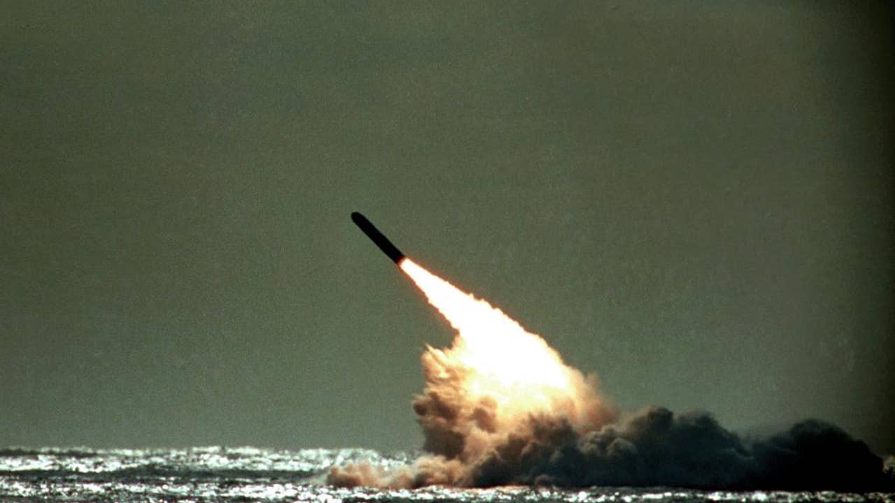 FILE - In this file photo dated Monday, Dec. 4, 1989, a Trident II missile launched by the U.S. Navy during a performance evaluation from the submerged submarine USS Tennessee in the Atlantic Ocean off the coast of Cape Canaveral in Titusville, Fla., USA. (The Associated Press)