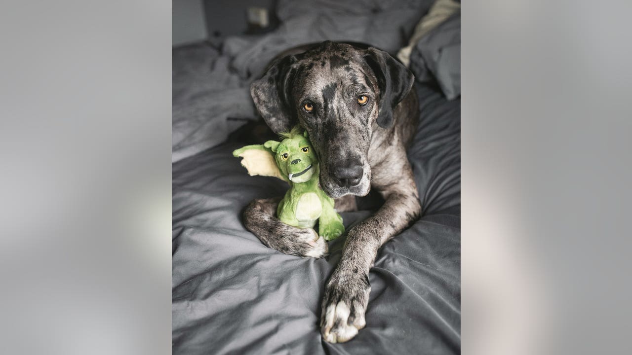 Pictures of Elliott Mae, a 3-year-old Merle Great Dane, have gone viral after they show the dazzling dog snuggling with a stuffed animal from the Disney movie "Pete's Dragon," British news agency SWNS reports.