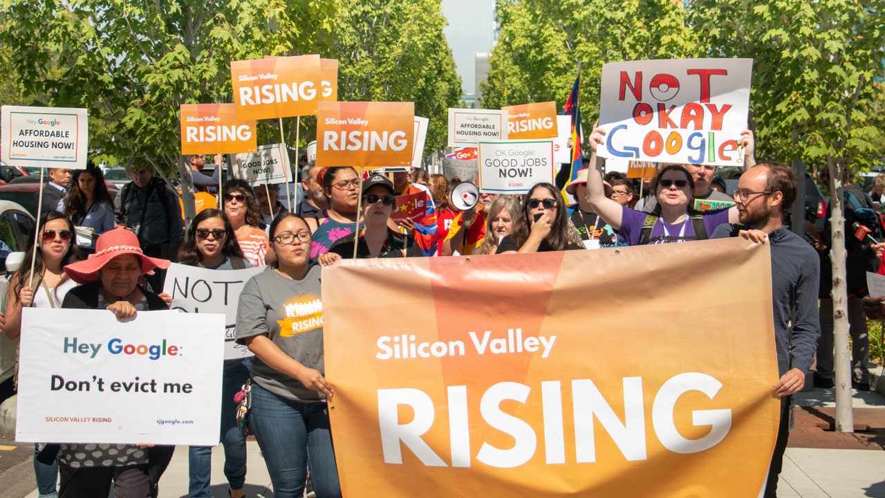 A coalition of activist groups, shareholders and employees demonstrated outside Google's headquarters in Mountain View, California, this week. (Silicon Valley Rising/Working Partnerships USA)