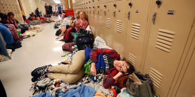 Emily Hindle lies on the floor at an evacuation shelter set up at Rutherford High School, in advance of Hurricane Michael. (AP Photo/Gerald Herbert)
