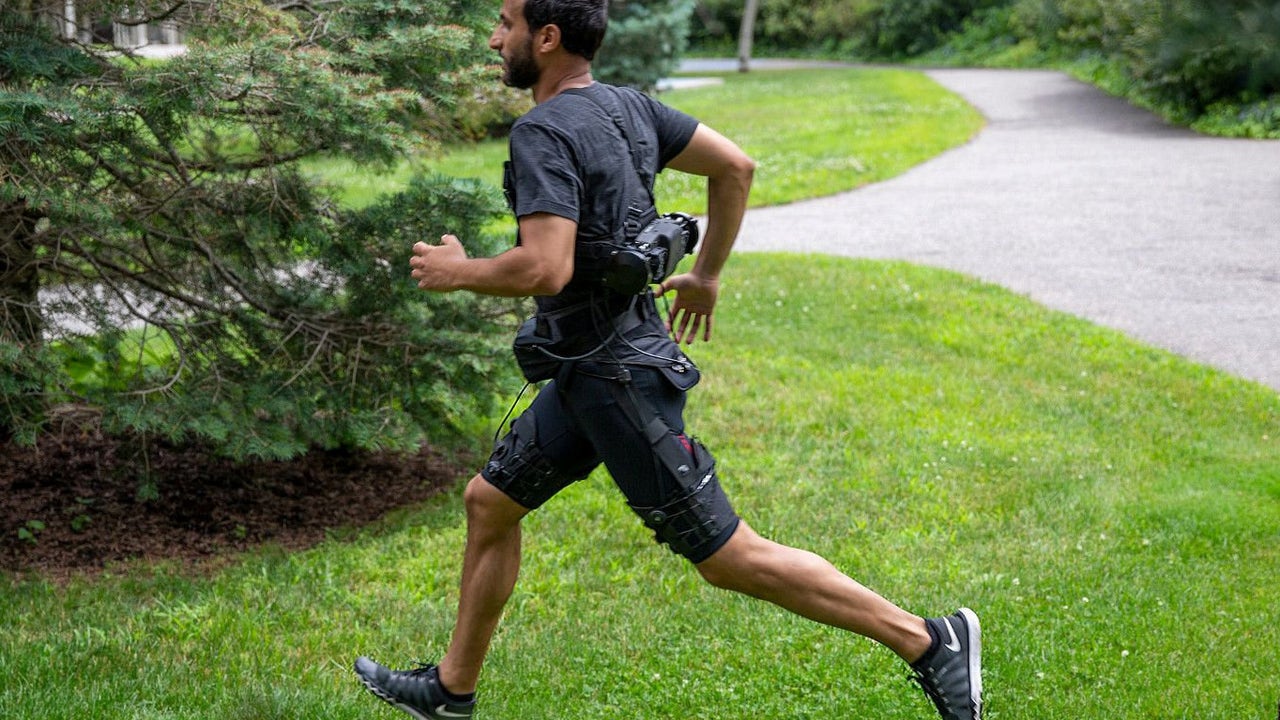 The suit is controlled by an algorithm that can detect whether the person is walking or running, and it's apparently the first machine of its kind that assists with both.