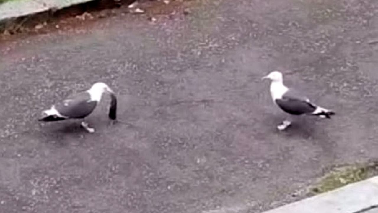 Upon looking out her window, she saw a few seagulls and a pair of magpies fighting the rodent, before eventually killing it. That's when she was able to get her phone out to capture the seagull swallowing the rat whole.