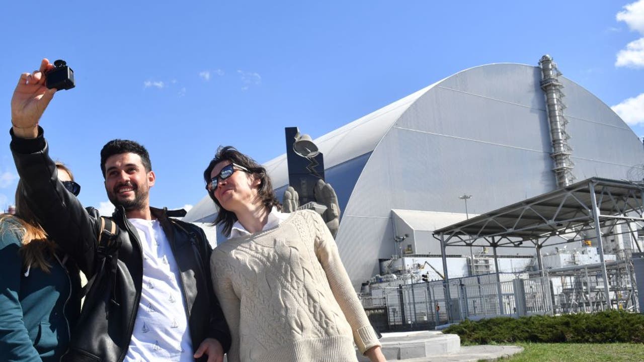 Tourists in the Exclusion Zone take selfies in front of the New Safe Confinement Structure, completed in 2017, which covers the fourth reactor of the Chernobyl nuclear power plant. (Sergei Supinsky/AFP/Getty Images)