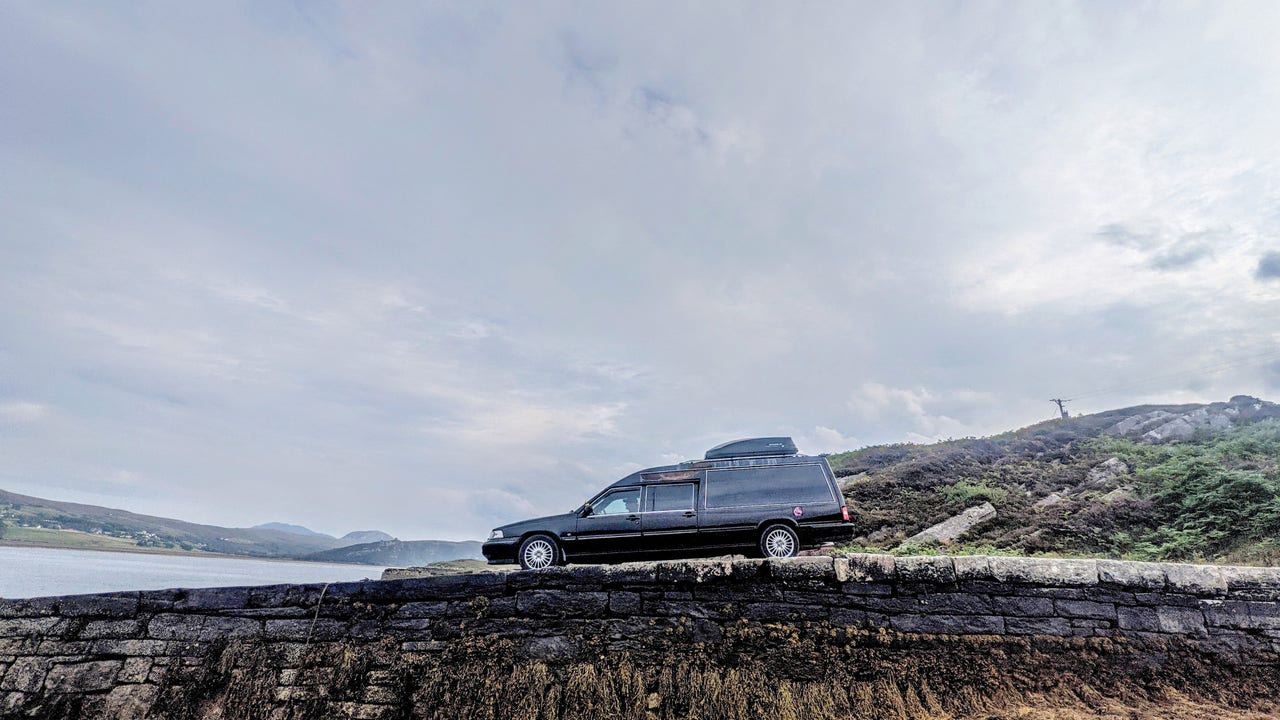 Shannon Orr, 24, and Iain Cameron, 31, from Warrington, U.K., drove across Scotland’s North Coast 500 in their 1998 Volvo 960 Hearse. (SWNS)