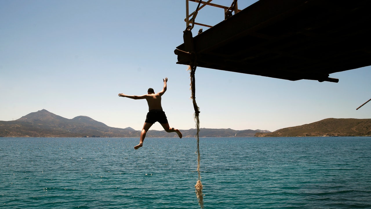 A boy dives into the sea from an old dock on the Aegean Sea island of Milos, Greece, Sunday, May 24, 2020. Greece's long-awaited tourist season will begin on June 15 with the opening of seasonal hotels and the arrival of the first foreign visitors, while international flights will begin heading directly for holiday destinations gradually as of July 1. (AP Photo/Thanassis Stavrakis)
