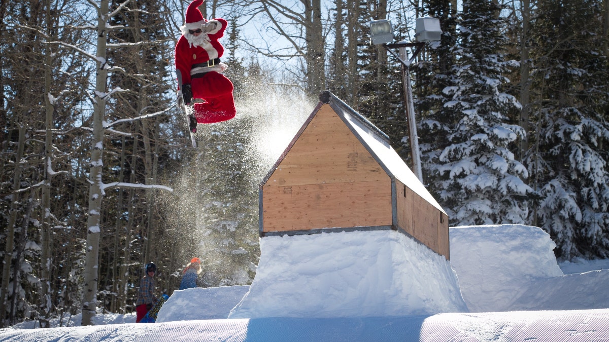 On Christmas Eve, the Snowbird Resort in Snowbird, Utah hosts a torchlight parade and fireworks show where Santa actually rappels out of the tram in a spectacular entrance. He and Mrs. Claus will be skiing around the resort all throughout the day.