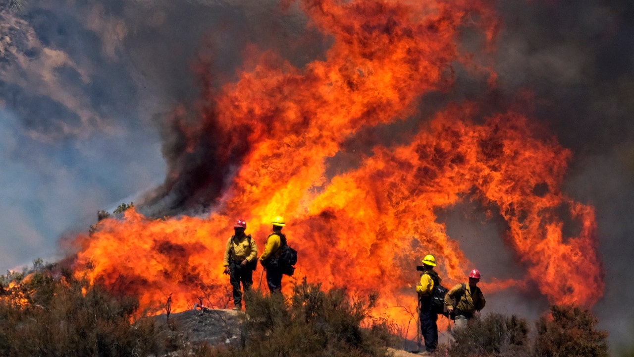 Firefighters watch the Apple Fire in Banning, Calif., Sunday, Aug. 2, 2020. (AP Photo/Ringo H.W. Chiu)
