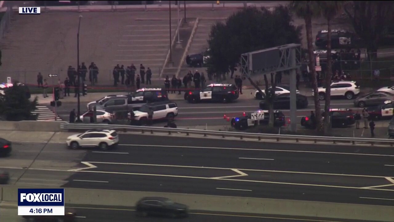 Police vehicles and officers block an intersection behind yellow tape after an officer-involved shooting and chase in San Jose, authorities said. (KTVU)