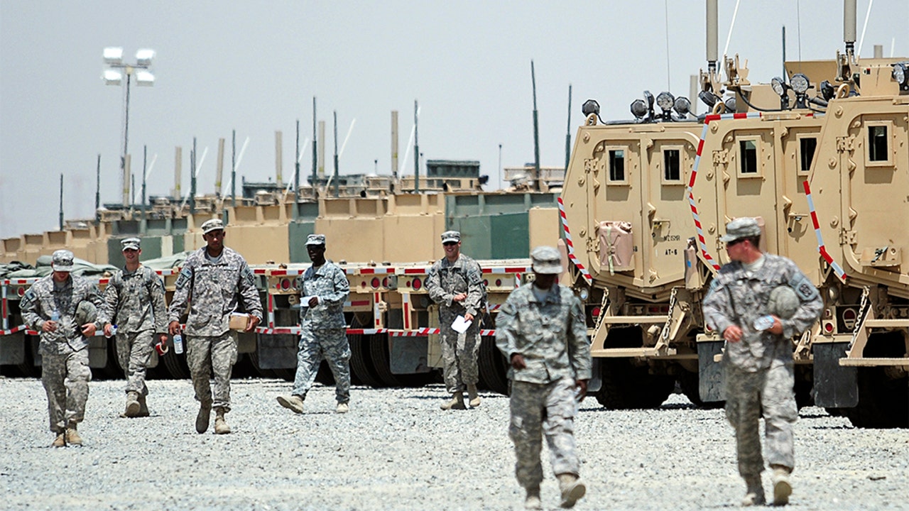 U.S. soldiers walk near vehicles at Camp Arifjan, Kuwait as they prepare to head to Iraq. (Reuters)