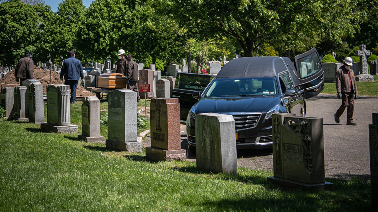 Cemetery workers prepare to bury a casket from McLaughlin & Sons funeral home, without any family present because of coronavirus restrictions, May 13, at Holy Cross Cemetery in the Brooklyn borough of New York. To help prevent the spread of the coronavirus, the casket is lowered and covered before relatives are allowed to the gravesite, following guidelines from the National Funeral Directors Association, according to a spokesman for the funeral home. (AP Photo/Bebeto Matthews)