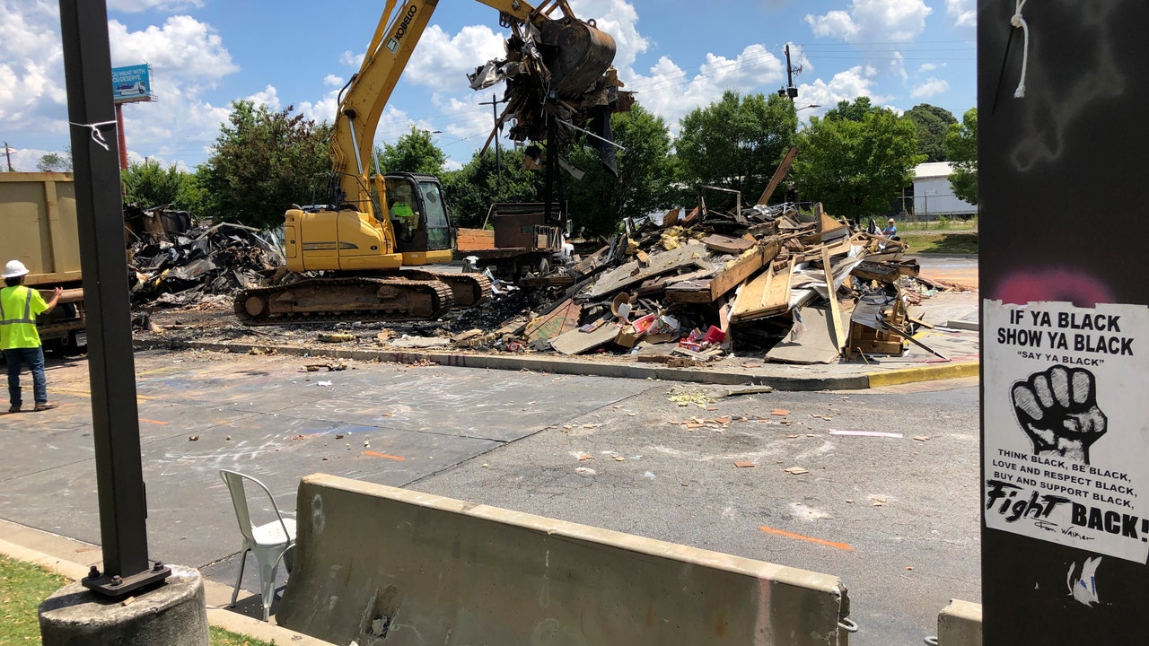 Videos showed construction crews on Tuesday morning using an excavator to demolish the charred remains of the restaurant that had been set ablaze by protesters on June 13, the day after Brooks, 27, was killed. The site had served as a focal point of demonstrations in the following weeks.