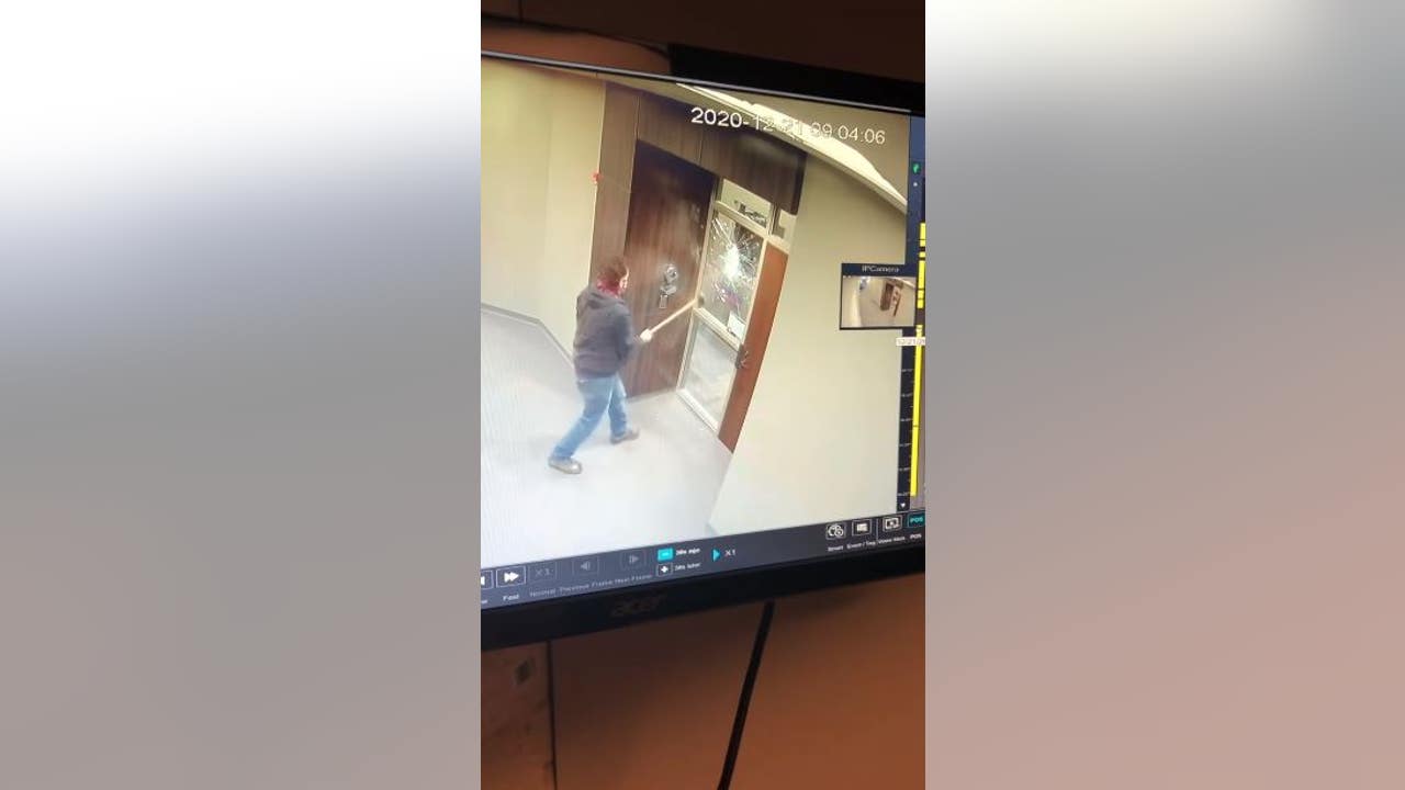 Surveillance video showed someone at Sen. John Hoeven’s Fargo office wearing a mask and holding an ax while walking up a staircase toward a door. He smashes a glass window beside the door, taking several swings before walking away.