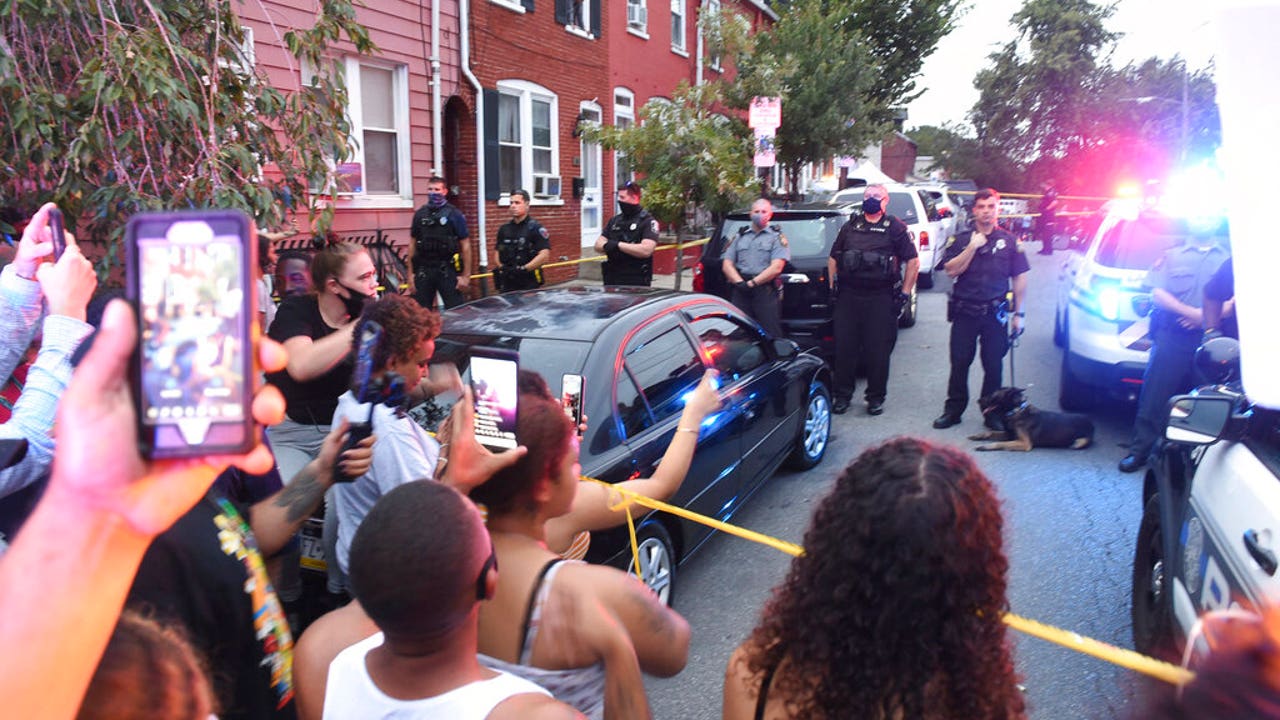 People chant during a protest at the scene of a police shooting on Laurel Street and Union Street in Lancaster city on Sunday, Sept. 13, 2020. (LancasterOnline via AP)