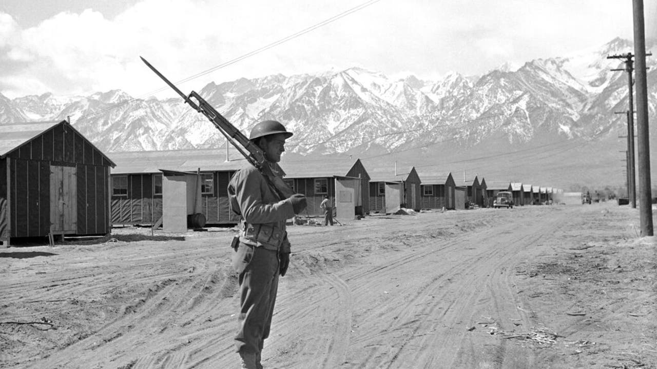 In this May 23, 1943, file photo, an American soldier guards a Japanese internment camp at Manzanar, Calif. (AP)