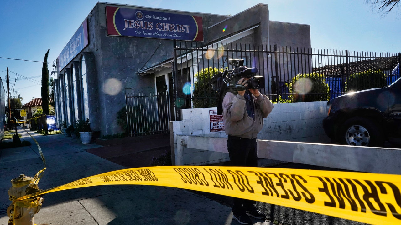 In this Wednesday, Jan. 29, 2020, file photo, crime scene tape is seen closing off an area around the grounds of the Kingdom of Jesus Christ Church in the Van Nuys section of Los Angeles. (AP Photo/Richard Vogel, File)