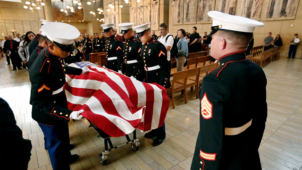 Marine pallbearers preparing the flag-draped coffin with the remains of Lance Cpl. Carlos A. Segovia-Lopez, during his funeral service in Los Angeles. (Al Seib/Los Angeles Times via AP)