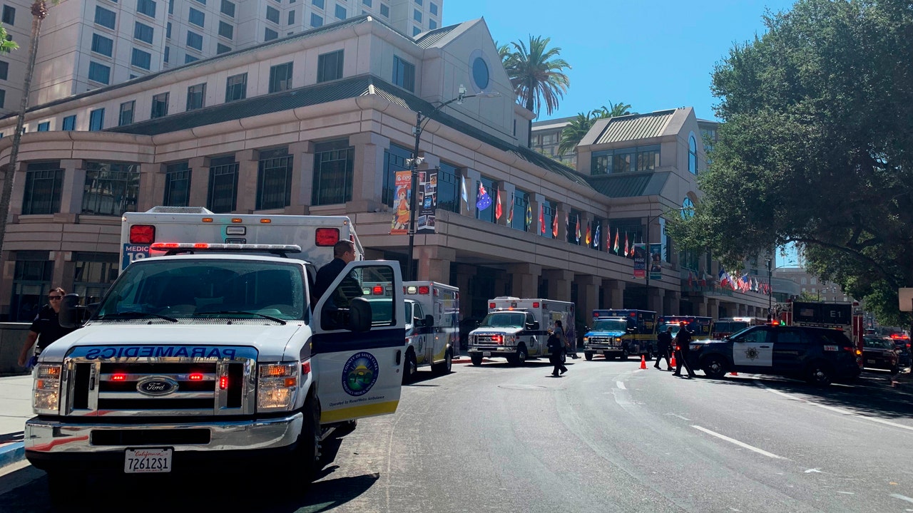 Fire crews gather on Market Street outside the Hotel Fairmont in downtown San Jose, Calif., after a report of a chemical odor Saturday, Aug. 31, 2019. (Nico Savidge/San Jose Mercury News via AP)