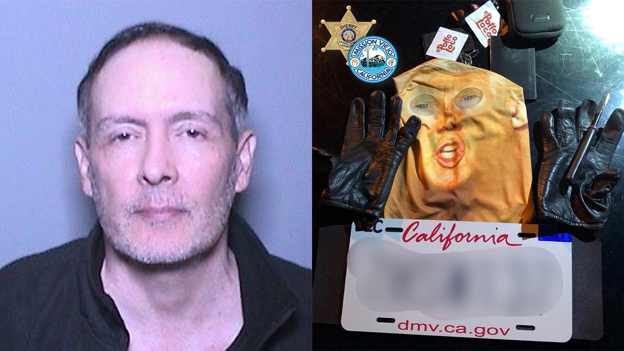 Deputies in Orange County, Calif., said a man was arrested Monday after he was caught vandalizing vehicles in a Trump mask. The suspect also had a loaded handgun, body armor, an airsoft shotgun, and helmet, and fake license plates, they said. (Orange County Sheriff's Department )
