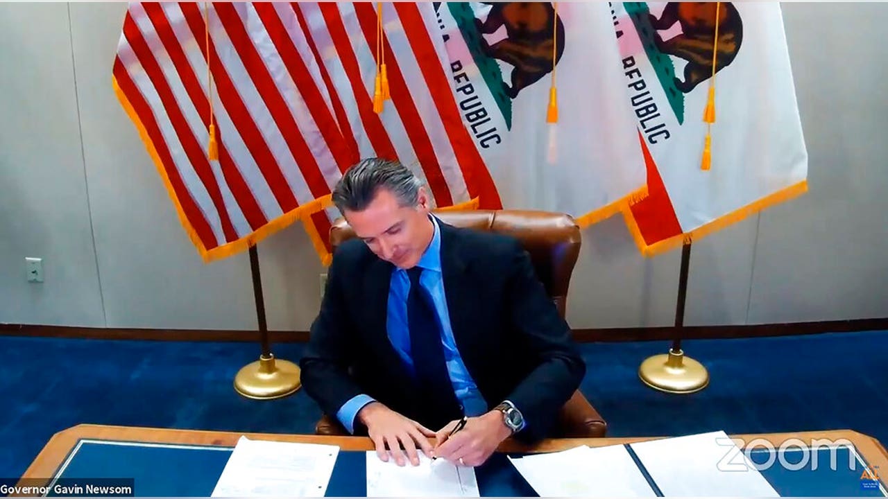 This image made from video from the Office of the Governor shows California Gov. Gavin Newsom signing into law a bill that establishes a task force to come up with recommendations on how to give reparations to Black Americans. (Office of the Governor via AP)