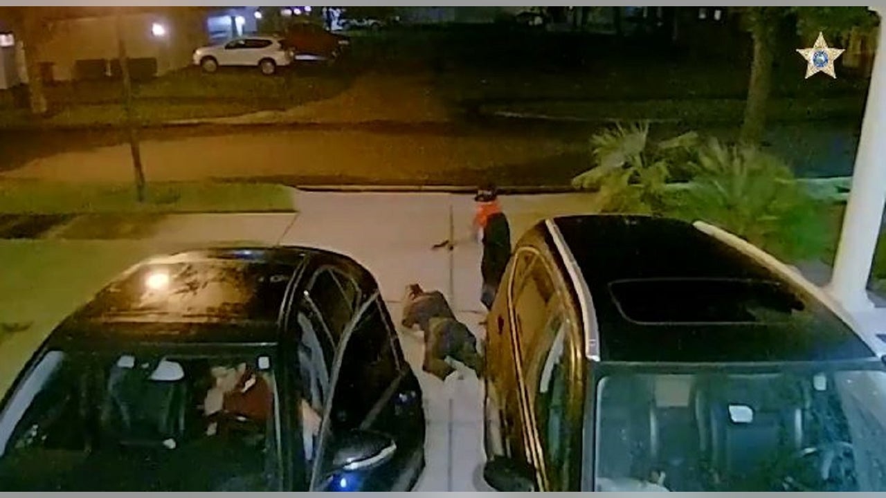 The Orange County Sheriff's Office released the footage of the two suspects approaching the Windermere resident as he parked his 2015 black Mercedes C350 in a driveway just after 10 p.m. The suspects appear to run from across the street in his direction as he exits the vehicle.