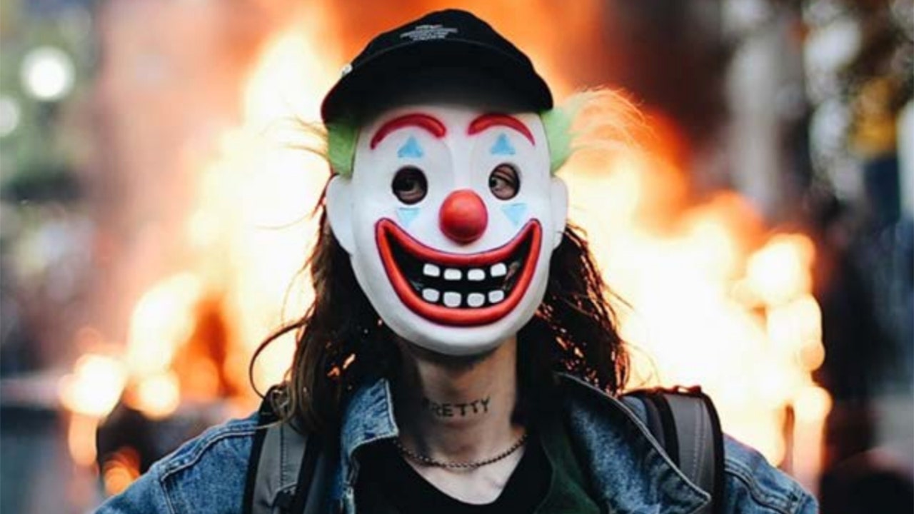 Photos of the scene show a man in a mask, similar to ones used in the 2019 “Joker” movie, a "Batman" spinoff that depicts citywide rioting leading up to its final scene.