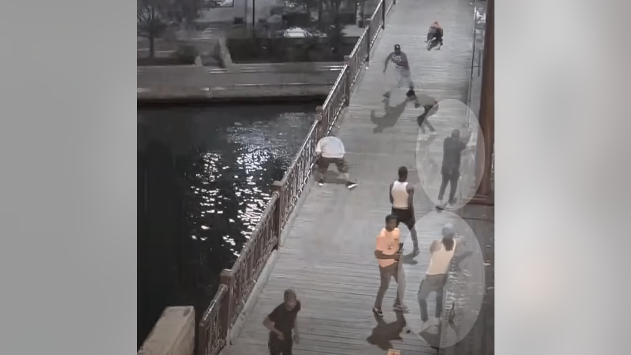 The nearly four-minute video shows a group of about 10 men walking on the Wabash Avenue Bridge before a few of them look off toward the street. Police highlight one man wearing black pants and a black T-shirt who then pulls out a gun and holds it in his right hand.