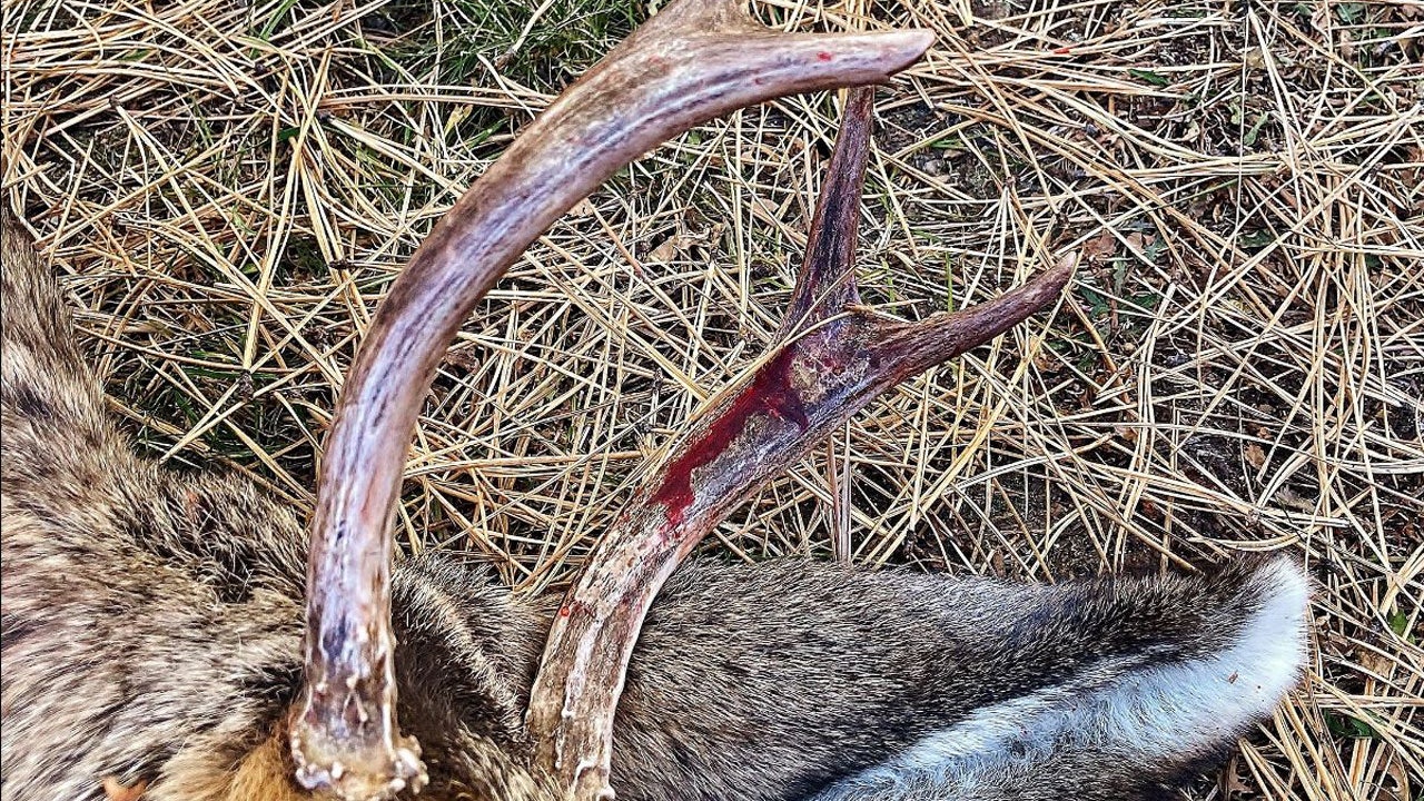 Blood stained the antlers of a young buck deer that attacked a woman walking her dog on a wooded trail near her Black Forest home on Friday. (Colorado Parks and Wildlife)