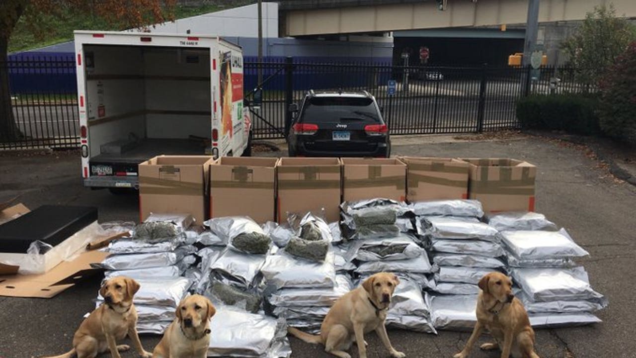 Police released a photo of the dogs, members of the Statewide Narcotics Task Force, posing with the confiscated bales of marijuana and the U-Haul.