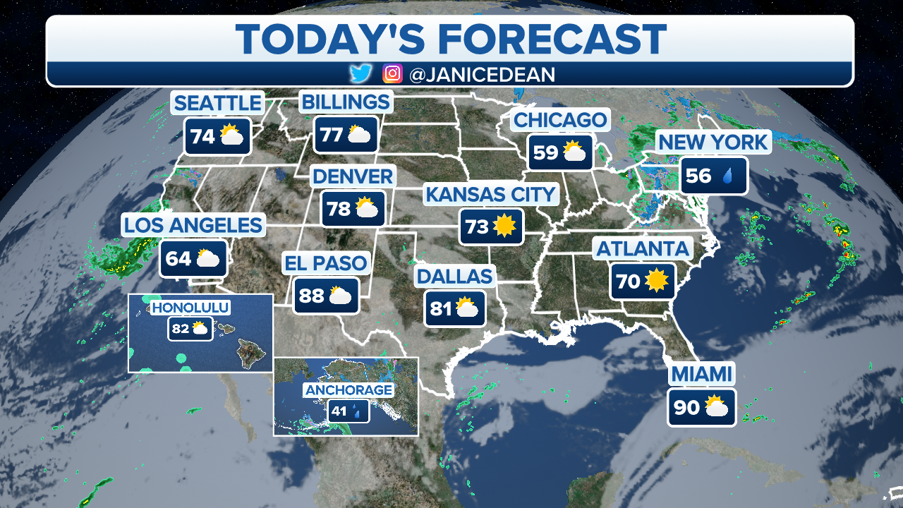 Above-average temperatures are expected to soar in between the two coasts, with the risk of strong-to-severe storms for the southern Plains, including Texas and Oklahoma.