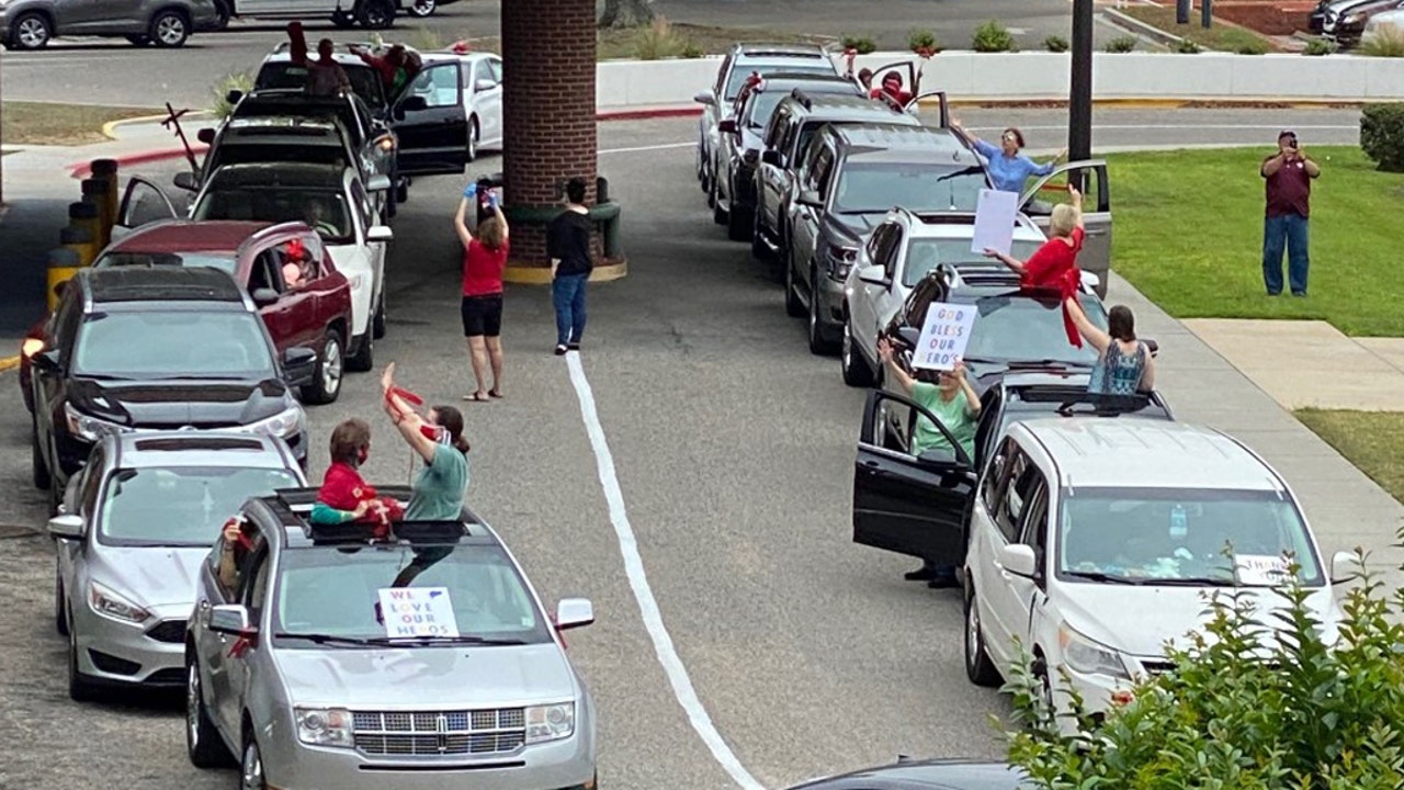 Unified Coast Prayer Movement members lined up their cars as staff and patients at Memorial Hosptial in Gulfport looked out the windows, stood outside, and joined in during their lunch break April 7.
