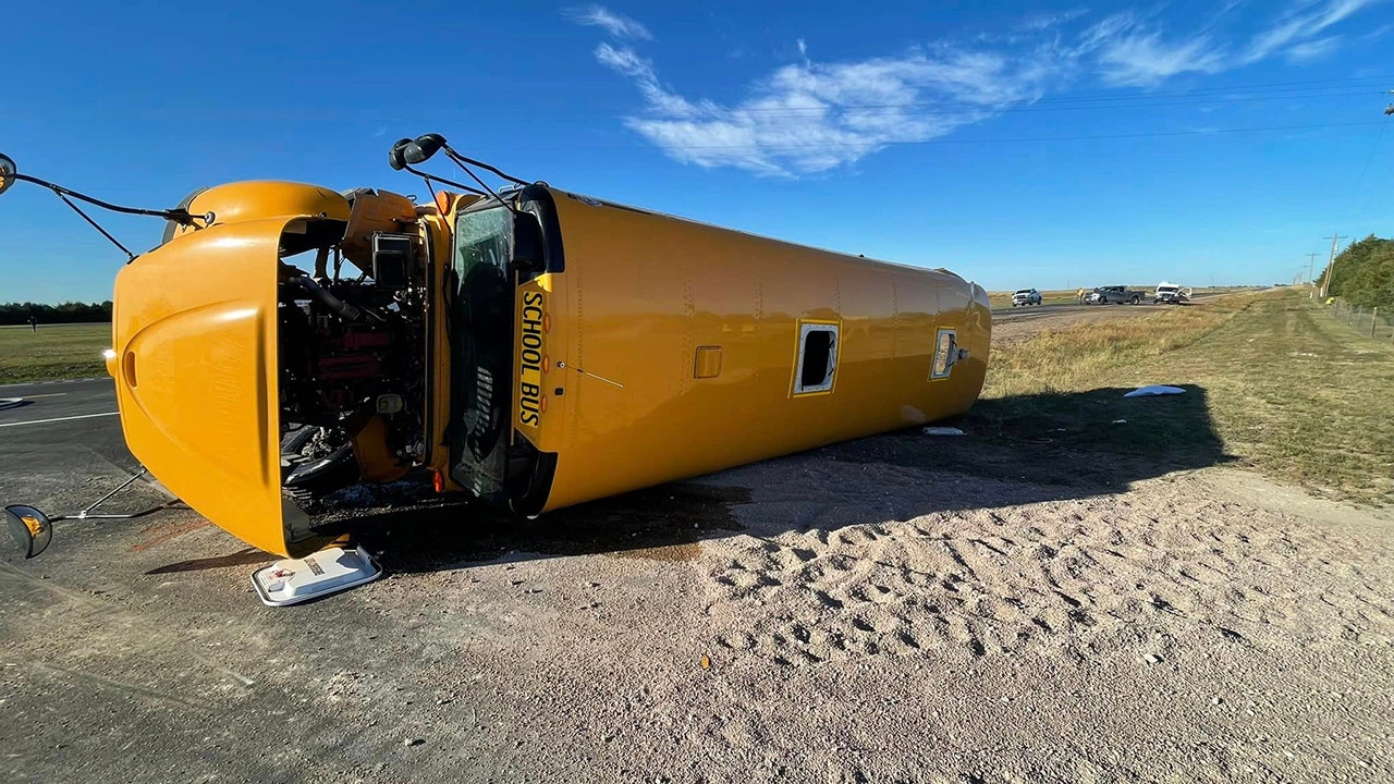 The school bus made a left turn and collided with the semi, which was hauling a trailer full of grain, according to authorities. The semi hit the rear passenger side of the bus, causing the bus to spin and flip over onto its driver’s side.
