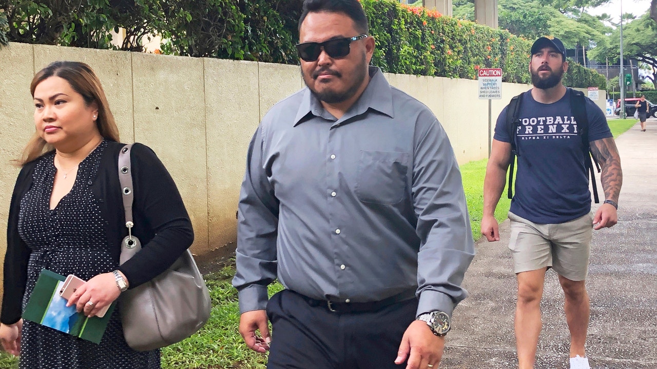 Former Honolulu police officer Reginald Ramones, center, walks down a street in Honolulu, on Sept. 25, 2019. (AP Photo/Jennifer Sinco Kelleher, File)