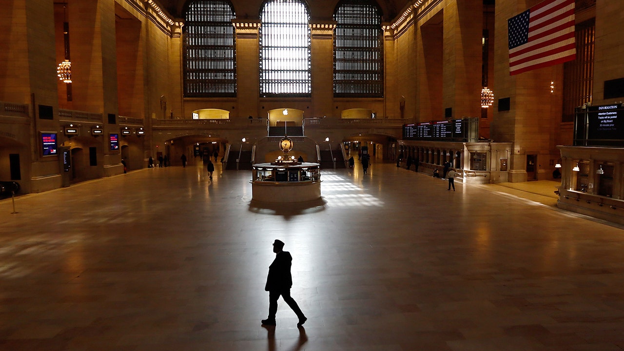 A train conductor walks through the virtually empty Grand Central Terminal on March 22, 2020, in New York City. (Photo by Gary Hershorn/Getty Images)