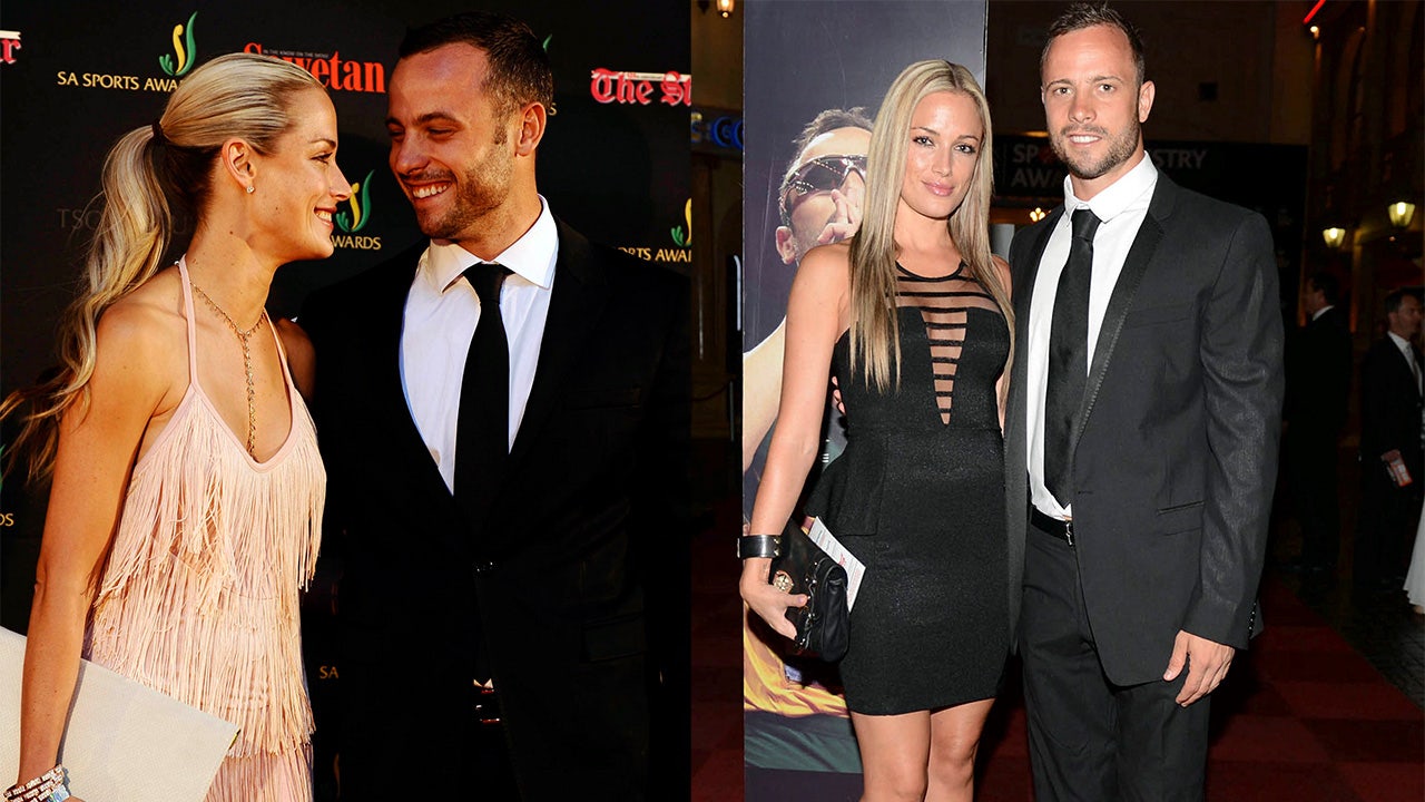 A photo combination of Reeva Steenkamp and Oscar Pistorius attending events before her 2013 murder. On the left, the couple is on their first date at the SA Sports Awards Gala Dinner Nov. 4, 2012, in Johannesburg, South Africa. On the right, the couple attend the Virgin Active Sport Industry Awards Feb. 7, 2013, also in Johannesburg. (Stephanie Makhlouf / Lefty Shivambu both via Getty)