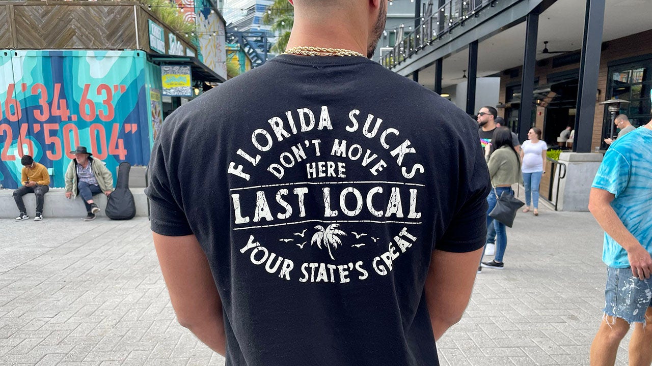 A man at Sparkman Wharf in Tampa wears a shirt showing his fears of Florida losing its freedoms as newcomers flood the state. "Don't move here. Your state's great." (Kerry J. Byrne/Fox News Digital)