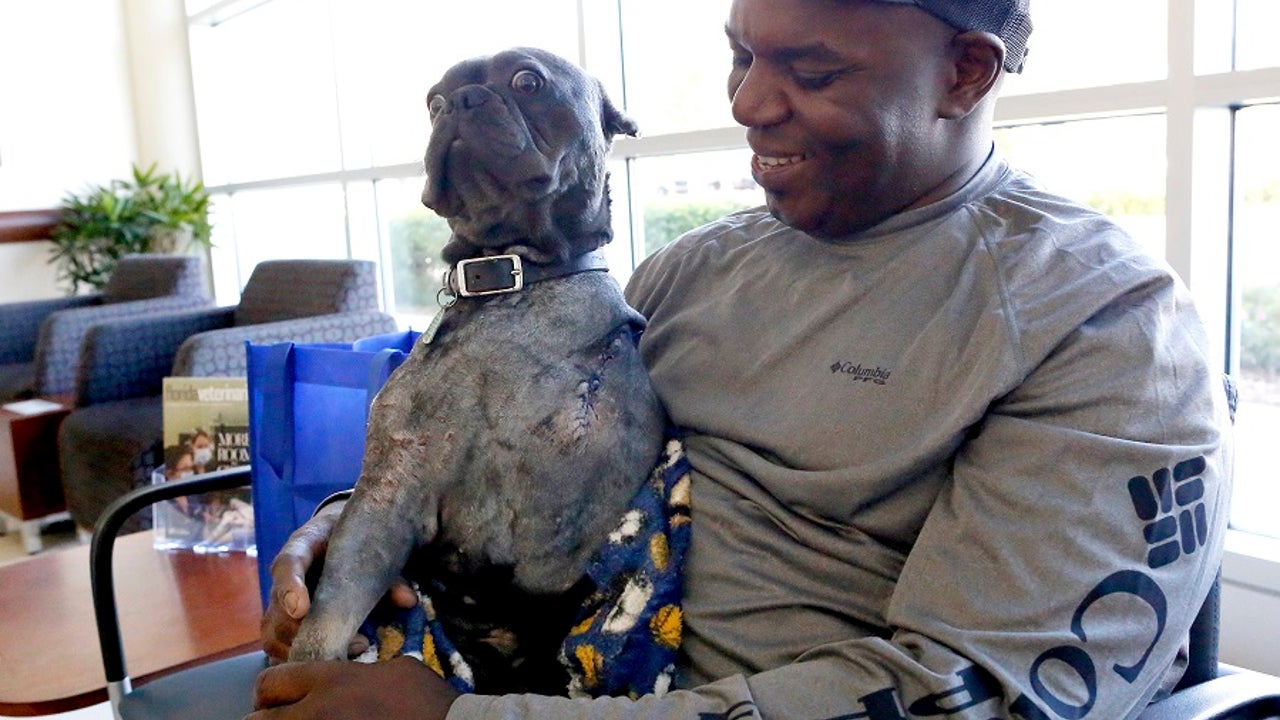 Gerald Ford holds his dog Neo, a French bulldog, at the Small Animal Hospital in Gainesville, Fla. Neo's heart stopped beating following the attack on Christmas Eve. In a rare occurrence, veterinarians at the University of Florida College of Veterinary Medicine were able to revive him. (Brad McClenny/The Gainesville Sun via AP)