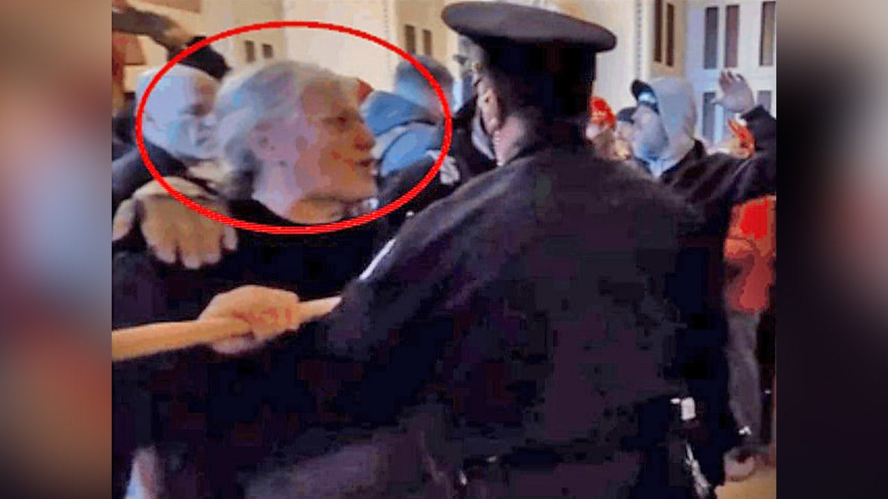 Court documents included a screenshot taken from officer-worn body camera footage of Audrey Southard-Rumsey allegedly pushing a U.S. Capitol Police sergeant with a flagpole. (FBI) (FBI)