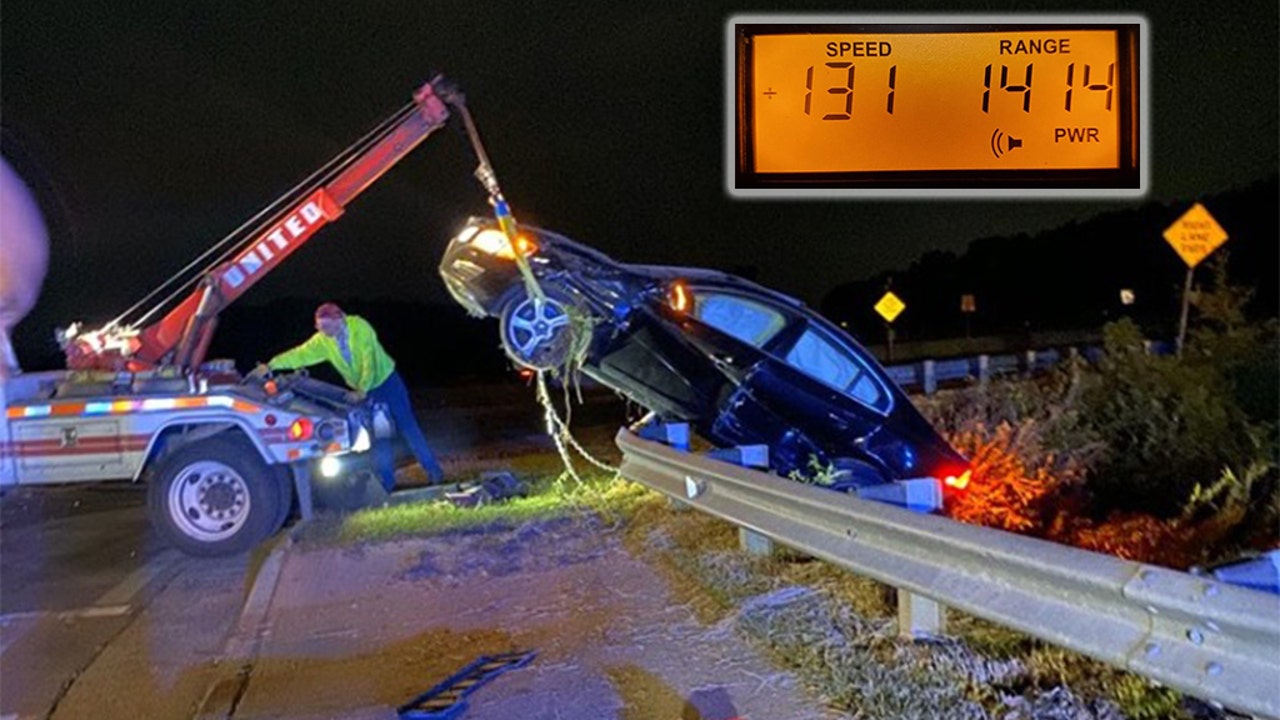 Photos of the incident show the wrecked vehicle being towed out from behind the guardrail, as well as the suspect's 131 mph speed captured on the officer's radar gun.